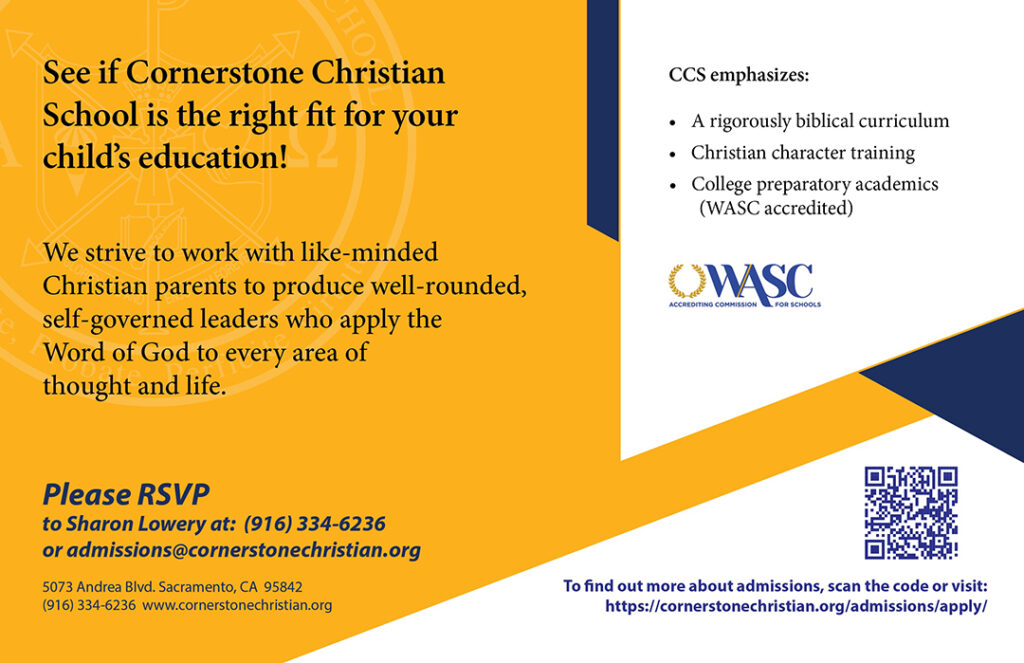 You’re invited to Preview Day on Monday, February 9, 2026 from 8:30-11 am! You will be blessed by participating in our chapel service and observing our excellent teachers in action. All classrooms will be open for you to sit in and enjoy. New families who attend Preview Day will receive $100 off tuition! RSVP: admissions@cornerstonechristian.org